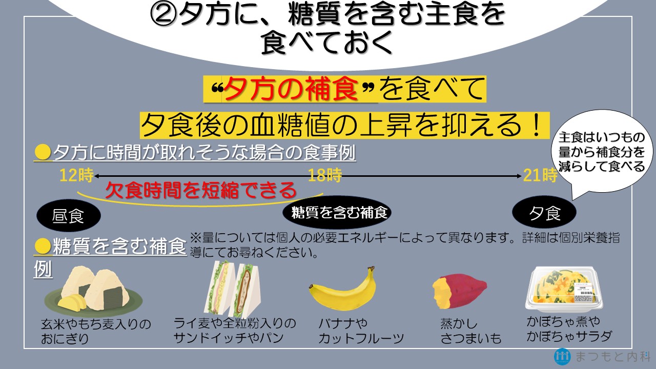 「昼食を摂ってから夕食まで長すぎる!」という方は、夕方に糖質を含む補食を摂っておくこともおすすめですよ。