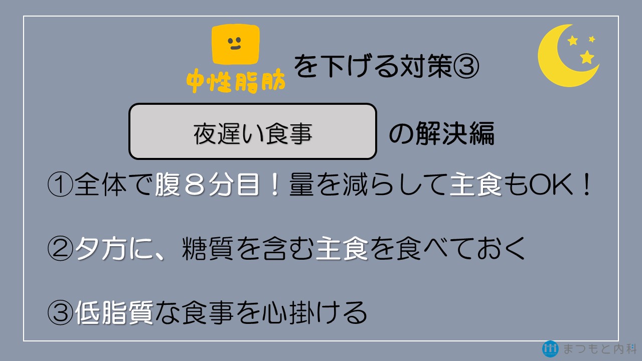 そんな方におすすめなのが、今回の中性脂肪を下げる対策の第3弾「夜遅い食事」の解決編3つの解決策です🌙