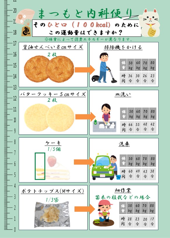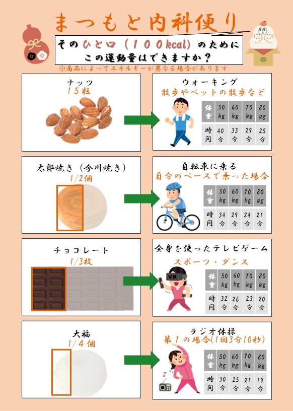 今月のまつもと内科便りは『❝ちょっとだけ❞のお菓子のための運動量』がテーマです。