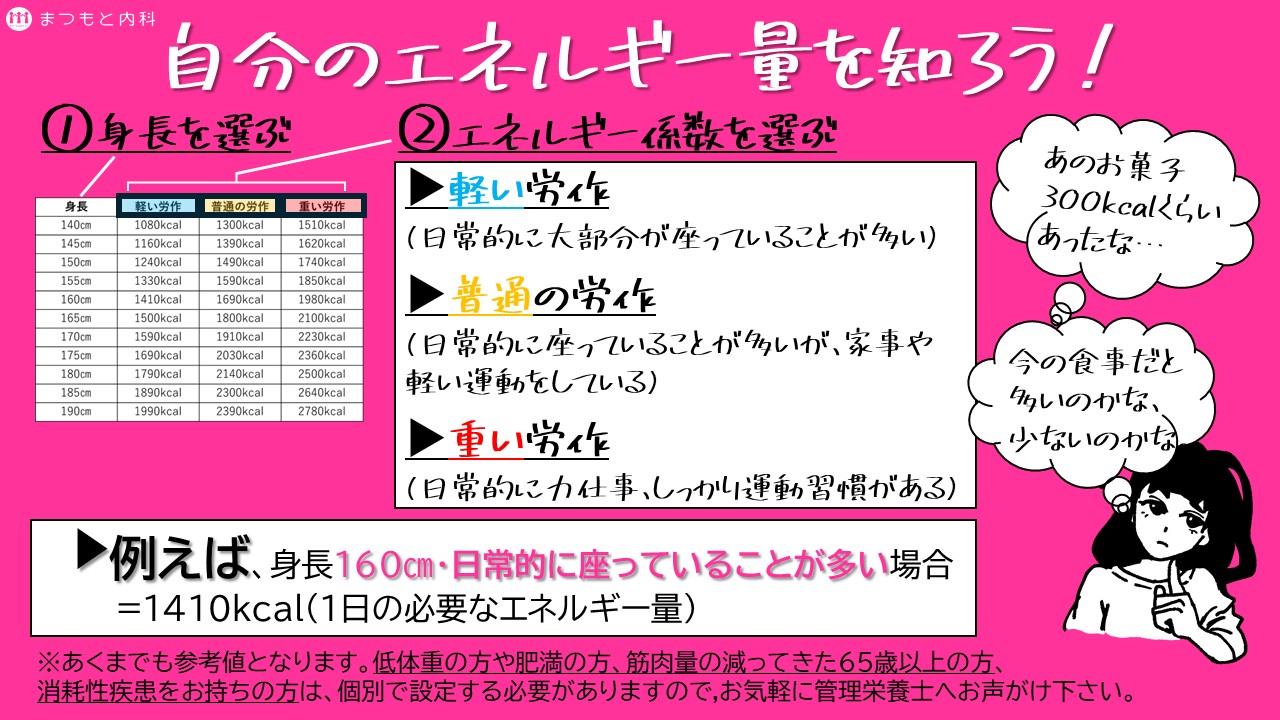 まつもと内科で実施している栄養指導では、食事記録表をもとに1日の摂取エネルギーを計算しています。