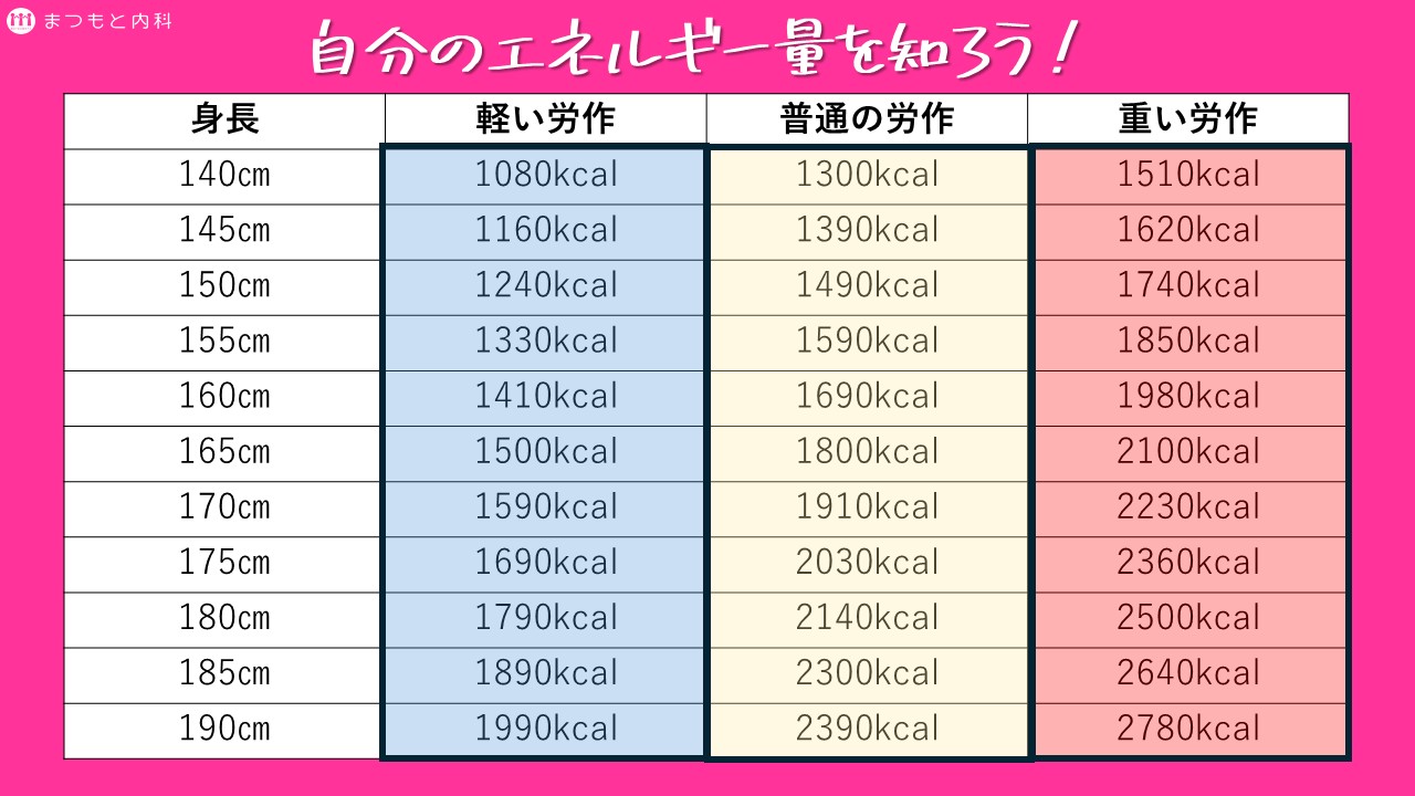 本来の必要なエネルギー量は、年齢や体格(やせ、肥満など)、そして目標体重とのバランスによって個別に調節していくことが大切です。